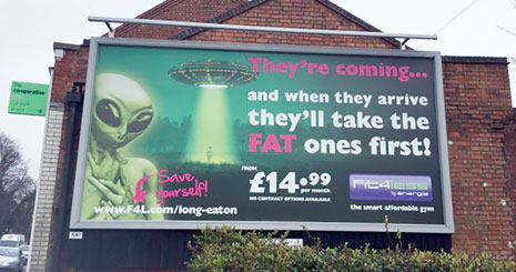 بیلبورد تبلیغاتی یك باشگاه ورزشی در انگلیس اخیرا رهگذران را با ادعای از لحاظ علمی غیرقابل اثبات خود نگران كرده است كه خبر از خورده شدن افراد چاق به محض حمله آدم فضاییها به زمین میدهد. حتی در قالب طنز نیز تحریك افراد چاق به عضویت در یك باشگاه ورزشی یك تاكتیك كمارزش است كه در عین ناامیدی چندان مخاطبان را شگفتزده نمیكند. البته باشگاه ورزشی «Fit4Less» بیلبورد را پایین نیاورد.عجیب آنكه این نخستین باشگاه ورزشی نیست كه بیلبوردی با این مضمون را نصب میكند.