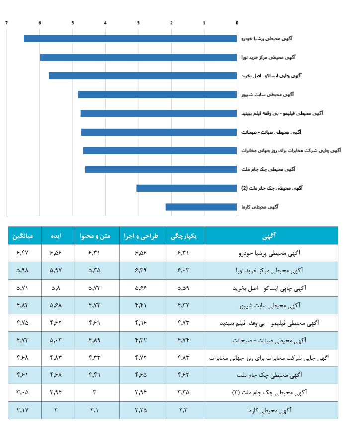 رتبه اول، دوم و سوم به ترتیب به آگهی محیطی پرشیا خودرو، آگهی محیطی مرکز خرید نورا و آگهی چاپی ایساکو اختصاص پیدا کرد.