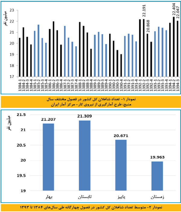 از آنجا که برخی شغل‌ها در کشور، به‌خصوص در بخش‌های کشاورزی و ساختمان، فصلی است، در فصول بهار و تابستان که فصل فعالیت‌های بیشتر است، افراد بیشتری نسبت به فصول پاییز و زمستان مشغول کار هستند. بنابراین اگر کسی بخواهد مخاطب را به اشتباه بیندازد، مستقل از اینکه چه دوره‌ای را بررسی می‌کند می‌تواند آمار پاییز را با تابستان مقایسه کند و نتیجه دلخواه خود را در زمینه نامطلوب بودن عملکرد اشتغال بگیرد. برای تشخیص بهتر تغییرات فصلی تعداد شاغلان، در نمودار‌(۲) متوسط تعداد شاغلان فصول چهارگانه کشور طی سال‌های ۱۳۸۴ تا ۱۳۹۳ منعکس شده است.