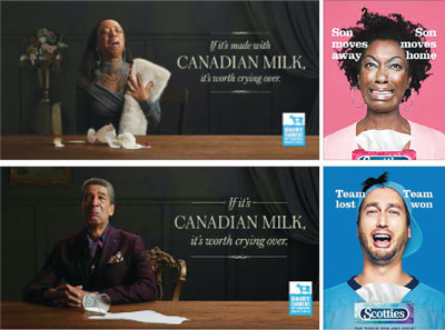 آژانس های مشهور تبلیغاتی چون دی دی بی (DDB)یا جان استریت (John St.) مثالهایی از این دسته هستند که کمپین هایی را با تصاویر عظیم غم انگیز و بعضا ناهنجار جهت برداشت مثبت مخاطبان راه اندازی کرده اند. مثال بارز آن حرکت اخیر دی دی بی در کمپینی است که به درخواست دامداران کشور کانادا برای ترغیب استفاده مردم از شیر و لبنیات تولید این کشور آغاز شده است و ابتدایی ترین تأثیری که بیننده از تصاویر می گیرد، حالات منفی و چهره گریان فرد مصور شده است که چنانچه پیشتر توضیح داده شد بیش از تبلیغات مثبت و خندان، جلب توجه می کند.