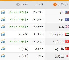در بازار ارز نیز امروز دلار آمریکا با 8 صدم درصد افزایش به 3 هزار و 730 تومان رسید.یورو 4 هزار و 245 تومان و پوند نیز4 هزار و 842 تومان قیمت گذاری شد.