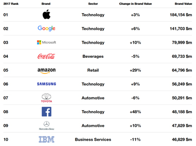 گزارش فوق نشان می دهد که در این فهرست فناوری، بخش غالب است. حفظ جایگاه نخست به وسیله Apple به عنوان ارزشمند ترین برند جهان برای پنجمین سال متوالی یا تداوم رتبه دوم گوگل برای مدت زمان مشابه این حقیقت را ثابت می کند. با 4.2 درصد رشد نسبت به سال 2016، ارزش 100 برند برتر جهان امسال در مجموع به یک میلیارد و 872 میلیون دلار رسید.