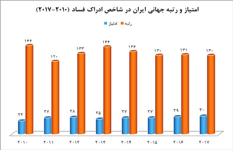 ایران در گزارش اخیر سازمان شفافیت بین الملل در مورد شاخص ادراک فساد، با کسب 30 امتیاز یعنی یک امتیاز بالاتر از سال گذشته، در رتبه 130 جهان و مشترک با کشورهای سیرالئون، گامبیا، میانمار و اوکراین قرار گرفته که نشان دهنده تنها یک پله بهبود نسبت به سال قبل است. این در حالی است که ایران در سال های اخیر هرگز نتوانسته است امتیازی بالاتر از 30 و رتبه ای بهتر از 120 در شاخص ادراک فساد کسب کند.