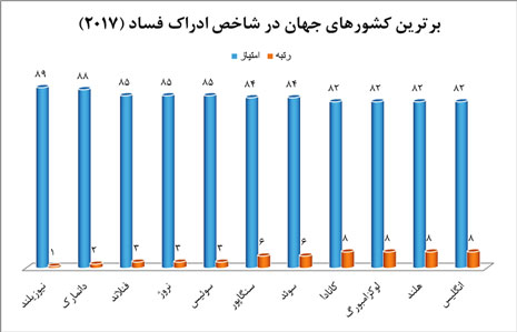 همچنین چنان که در اغلب شاخص های مهم اقتصادی و رفاهی دیگر نیز مشاهده می شود، در رتبه بندی شاخص ادراک فساد نیز هر چهار کشور منطقه اسکاندیناوی شامل دانمارک، فنلاند، نروژ و سوئد در بین 10 کشور برتر جهان قرار گرفته اند؛ هرچند کشور نیوزیلند توانسته است بالاتر از همه این کشورها بر جایگاه نخست جهان تکیه بزند. علاوه بر کشورهای یادشده، نام کشورهای دیگری همانند سوئیس، سنگاپور، کانادا، لوکزامبورگ، هلند و انگلیس نیز در جمع کشورهای برتر در این شاخص دیده می شود.