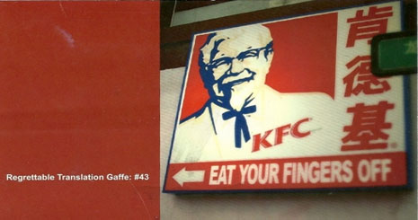 رستوران زنجیره ای معروف آمریکایی در همان روزهای آغازین کمپین تبلیغاتی در شهر پکن چین مجبور به جمع آوری بنرهای تبلیغاتی خود شد. علت این اتفاق یک اشتباه به ظاهر کم اهمیت در ترجمه کردن شعار تبلیغاتی این رستوران بود: "اینجا انگشت هایتان را می خورید!"