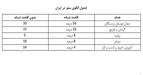 بيش ترين سفرهاي با اقامت شبانه فصل بهار در سال ١٣٩٦، با هدف ديدار دوستان و بستگان (٥٦ درصد)، گردش و تفريح (٢٦ درصد) و زيارت و درمان (هر يك ٨ درصد) انجام پذيرفته است. سفرهاي با اهداف فوق در مجموع ٩٦ درصد از سفرها را تشكيل داده است. حدود ٤ درصد از سفرها در فصل بهار با اهدافي نظير آموزش، خريد و کسب و کار انجام شده است.