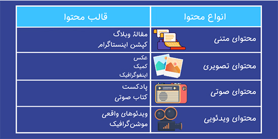 گفتیم که محتوا انواع مختلفی دارد و می تواند در قالب های مختلفی ارائه شود. انواع محتوا را در جدول زیر می بینید و در مقابل آن هم می توانید نمونه ای از قالب های موجود برای آن نوع از محتوا را ببینید.