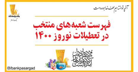 ضمن عرض تبریک پیشاپیش به مناسبت فرارسیدن سال نو و آرزوی سلامتی و موفقیت برای کلیه هم وطنان گرامی، ساعات کار شعبه های منتخب بانک پاسارگاد در تهران، شهرستان ها و مناطق آزاد (طبق لیست پیوست)، در روزهای سوم و چهارم فروردین سال...