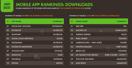 در سال گذشته تیک تاک درست به مانند سال قبل موفق شد تا عنوان بیشترین میزان دانلود را در بین تمامی اپلیکیشن ها را به دست آورد. در رتبه های بعد فیس بوک، واتس اپ و زوم قرار گرفته است. در رابطه با بازی ها نیز شاهد یک اتفاق جالب بوده ایم. free fire در نخستین سال انتشار خود موفق شد تا عنوان بیشترین میزان دانلود را به دست آورد. این امر در حالی است که این آمار در سال قبل در اختیار among us بوده است.