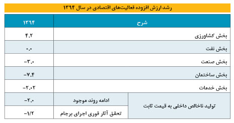 با توجه به عملکرد اقتصاد در شش ماهه اول و وضعیت ادامه سال، رشد بخش خدمات در سال 1394 حدود 2/2- درصد برآورد می‌شود.در نهایت، ارزیابی وضعیت رشداقتصادی کشور در شرایط ادامه روند موجود و بر مبنای عملکرد فصول اول و دوم برآورد روند پیش‌رو به تفکیک بخشی در سال 1394 نشان می‌دهد که رشد اقتصادی این سال منفی خواهد بود. رشد بخش‌های کشاورزی، نفت، صنعت، ساختمان و خدمات در سال 1394 به ترتیب حدود 4/2، 0/0، 3/0-‌، 7/4- و 2/2-‌ درصد برآورد می‌شود که به معنای رشد اقتصادی حدود 2/0-‌ درصدی کل اقتصاد است.